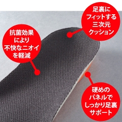 「バードウォッチング長靴」にぴったりのインソール! バードウォッチング長靴は、「折りたたんで持ち運びができる」「干潟など、地面が柔らかい場所で使用する」ことを想定して開発されました。 そのため、街中などで長靴を使う方から「硬い路面を長時間歩くと、靴底が薄く柔らかいため疲れる」というご意見をいただくことがあります。 そこで、20種類以上のインソールをテストし開発したのがこの「ソールラック サポート」! 街中の硬い路面での使用が多い方におすすめです。 かかとから土踏まずにかけて硬めのパネルがしっかりと足裏をサポートし、長時間の歩行でも疲れにくいのが特長です。 ●足裏にフィットする三次元クッション。疲れを軽減します。 ●抗菌効果により不快なニオイを軽減。 ●硬めのパネルでしっかりと足裏をサポート。 ■素材:ポリエステル・EVA・PP ■重さ(約):45g(M用片足) ■中国製